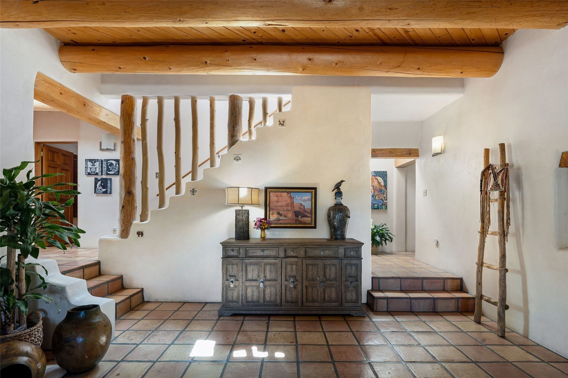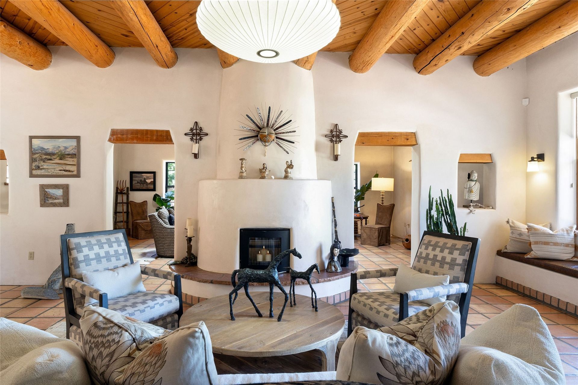 Welcome to 104 Calle Paula in highly coveted Sol y Lomas, an exquisitely appointed 4-bedroom, 3.5-bath home set on 1.12 private, beautifully landscaped acres in the heart of Santa Fe. Offering a rare blend of in-town convenience and country-style living, this property is thoughtfully designed for both everyday comfort and effortless entertaining. The updated chef's kitchen features Wolf and Viking appliances, custom cabinetry, and sleek stone countertops. Enhancing functionality and flow, the layout has been thoughtfully improved with a reconfigured connection between the kitchen and dining area, along with the addition of a dedicated interior laundry and mudroom. The primary suite offers a quiet retreat with a spa-like bath, walk-in closet, and private patio with expansive views to the north, east, and west. Classic Santa Fe elements including high ceilings with large vigas, multiple kiva fireplaces, and artisanal finishes bring warmth and character throughout the home. Shaded portals, peaceful patios, and lush gardens with mature trees create a seamless indoor-outdoor living experience, further complemented by a small orchard, greenhouse, and chicken coop. A detached studio provides flexible space for a home office, art studio, or for guest overflow. Tucked within a quiet enclave just minutes from the Santa Fe Plaza, restaurants, shopping, and medical facilities, this property offers a rare combination of privacy, comfort, and convenience.
