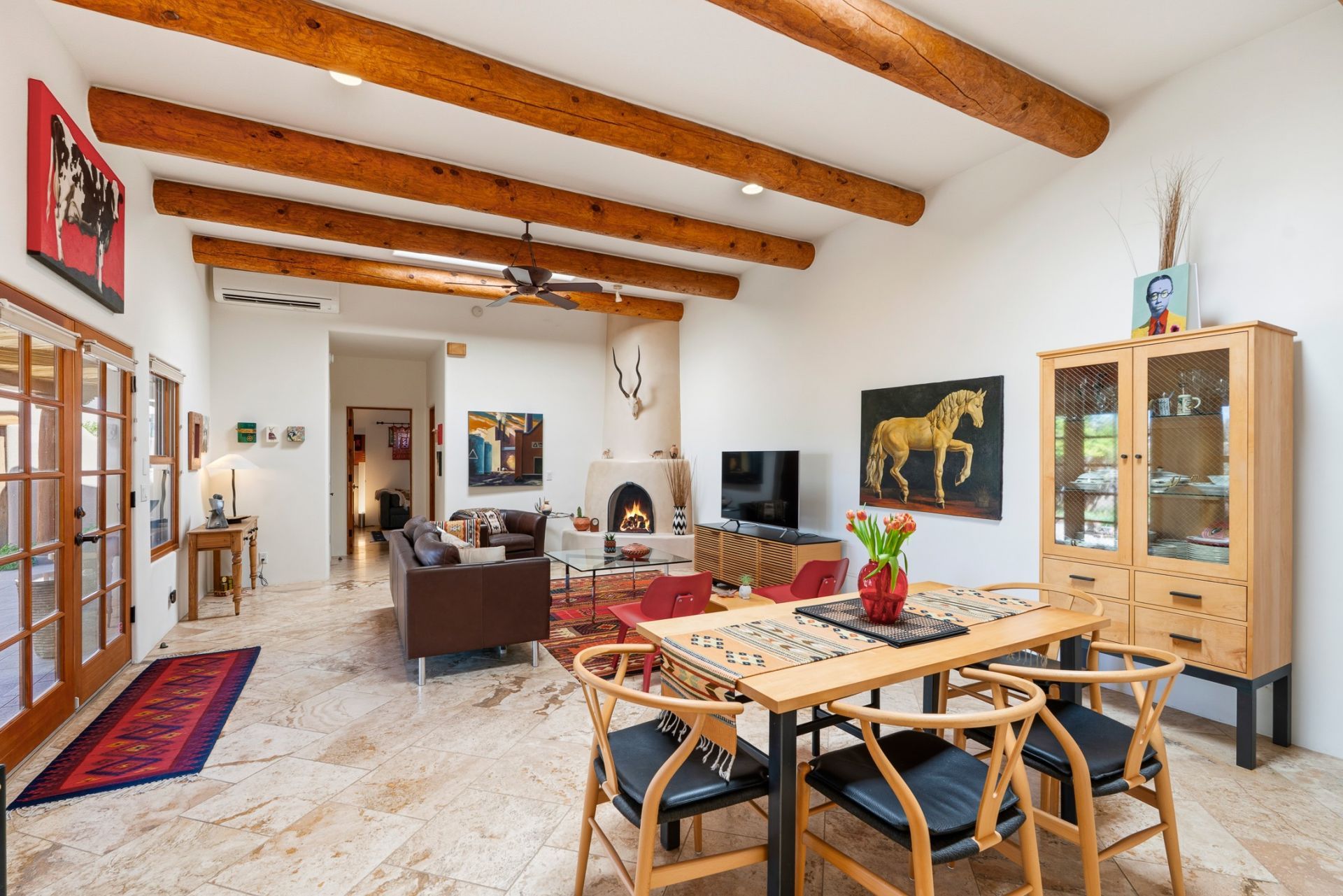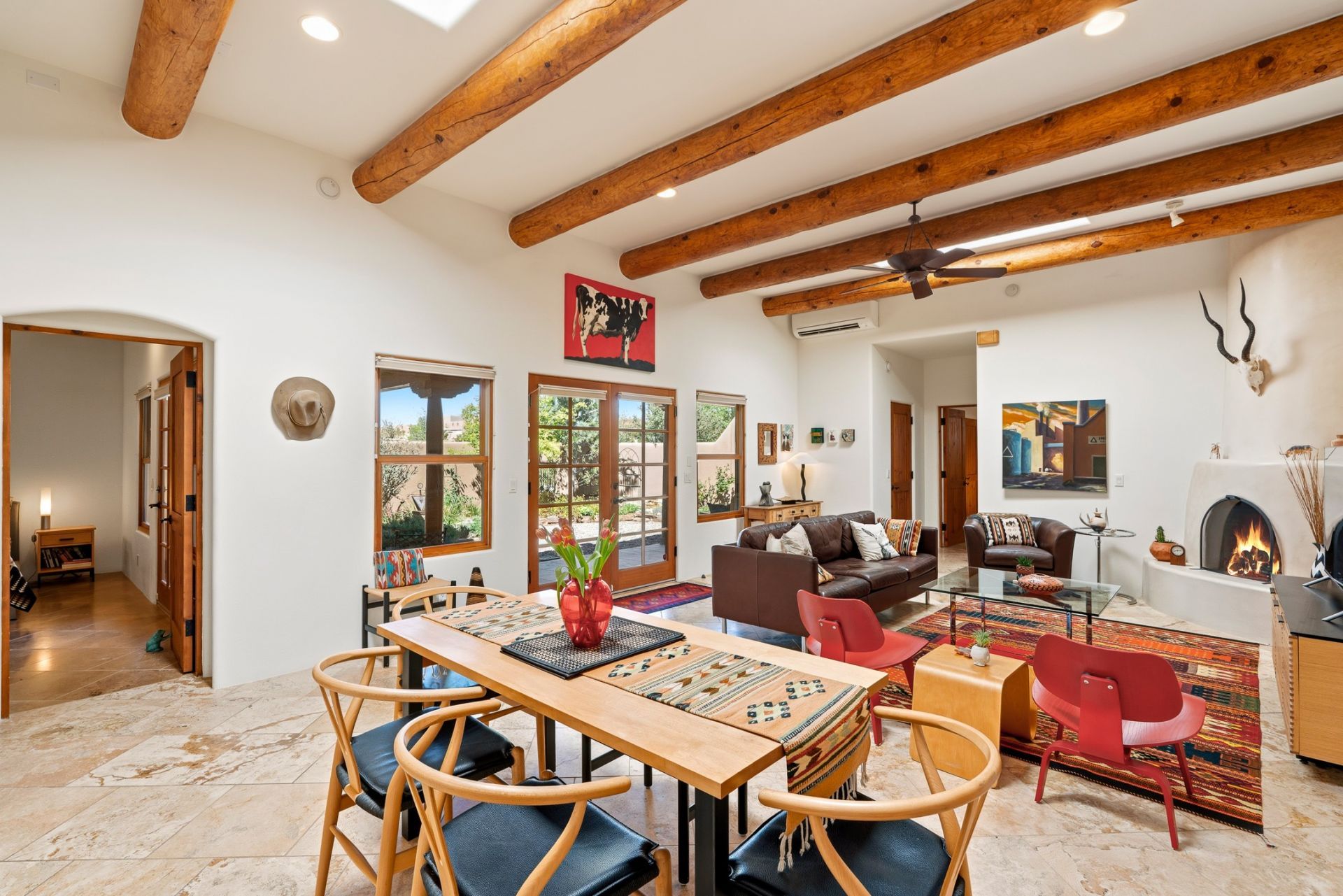 Tucked behind gated entry, this inviting courtyard residence in Aldea de Santa Fe offers a warm blend of comfort, flexibility, and easy living?equally suited for those seeking a peaceful retreat or a home that adapts to a modern, connected lifestyle. Thoughtfully designed on a single level, the 3-bedroom, 3-bath layout is filled with natural light and timeless Santa Fe character. Travertine floors, beamed ceilings, and a kiva fireplace create a welcoming ambiance in the open-concept living and kitchen area?perfect for quiet evenings or casual gatherings. The spacious primary suite opens directly to the courtyard, creating a seamless indoor-outdoor flow. The ensuite bath features dual sinks, a soaking tub, separate shower, and a generous walk-in closet. On the opposite side of the home, a well-separated guest bedroom with its own exterior entrance offers ideal flexibility?whether for a home office, studio, or private guest space. A detached casita with its own entrance off the back courtyard provides even more versatility, perfect for visitors, remote work, or creative pursuits. A two-car garage is conveniently accessed from the alley, with ample guest parking nearby. Four ductless mini-split units provide efficient heating and cooling year-round. Located in desirable Aldea de Santa Fe, a vibrant village-style community, residents enjoy 13 miles of walking trails, extensive shared open space, a community center, and tennis, basketball, and bocce courts. Neighborhood life is enhanced further with annual art tours, community garage sales, and a variety of active clubs?participate as much or as little as you like. The low-maintenance design and single-level living make everyday life effortless. A home that balances tranquility, connection, and flexibility?ready to be enjoyed in your own way.