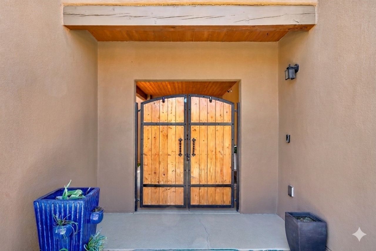 Welcome to refined Southwest living in the coveted La Pradera community, where the enchantment of Santa Fe meets soft contemporary elegance. This stunning move-in ready residence showcases the celebrated Zaguan floor plan, drenched in natural light through expansive windows that frame the breathtaking New Mexico landscape. Handcrafted double cedar gates open to a private courtyard adorned with a stone fountain and dramatic landscaping, setting a tone of quiet sophistication. Inside, exceptional finishes abound ? a Kiva fireplace, tile flooring, and high wood-beamed ceilings create an atmosphere of luxury and warmth. The gourmet kitchen features a four-burner Wolf convection oven, Sub-Zero Cove dishwasher, Jennair counter-depth refrigerator, Silestone countertops, and soft-close cabinetry. The light-filled primary suite offers a private ensuite bathroom with a custom tiled shower, deep soaking tub, dual walk-in closets, and a dedicated water closet. A second bedroom extends to the portal and a walled, private yard. Steps from the main residence, a separate guest casita provides a living room, bedroom, and luxury bath ? ideal for visitors or potential rental income. Beautiful outdoor living continues through a generous backyard with open space, suited for entertaining beneath endless turquoise skies. Additional highlights include a three-car finished garage with electric vehicle charging and epoxy floor, 2 tankless hot water heaters, whole-house air purification, steam humidifier, and reverse-osmosis water system. La Pradera is known for its paved walking paths and hiking trails within the neighborhood and just outside the entrance. These trails are in the foothills and high desert between La Pradera and neighboring developments. Ideally situated near Sunset Park, Santa Fe Community College, shopping, and dining, this extraordinary residence embodies the beauty and soul of the Southwest. Schedule your private showing today. Don't miss the 3-D Matterport and drone footage in the listing!