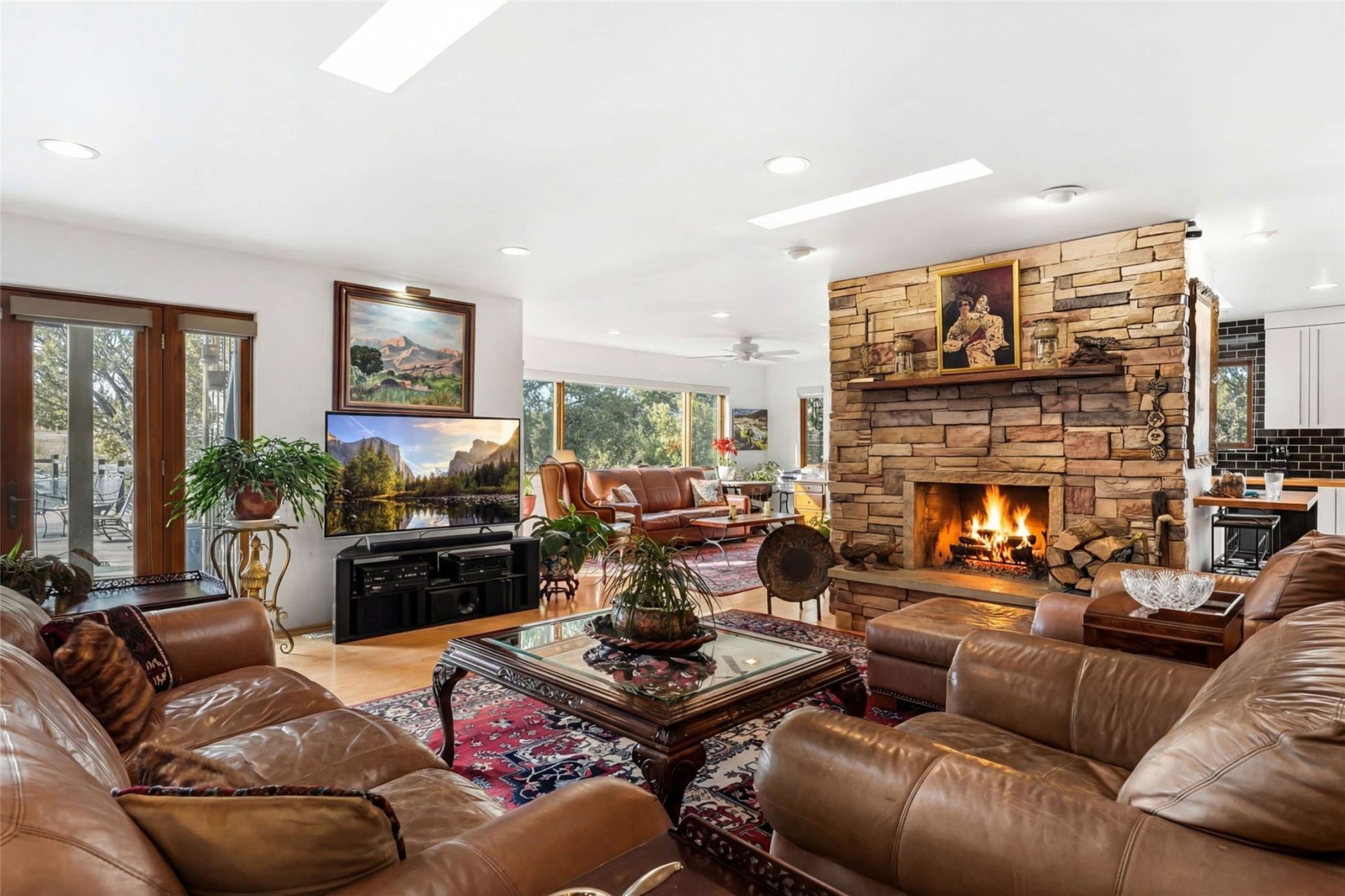 Light and Sky - where Santa Fe light meets endless sky, this enchanting 3 BR / 2BA single-level home reveals itself with effortless elegance. Set on apx 2.14 acres and offering apx 2,520 sqft of luminous living, it is a sanctuary of quiet refinement ? rooms that welcome the day, frame the horizon, and inspire reflection and imagination. Warm and gracious, this home was designed to be lived in, admired, and remembered. Expansive windows and skylights draw abundant sunlight inward, illuminating blonde wood floors and interiors anchored by a sculptural stacked-stone fireplace. The living spaces embrace light and landscape with subtlety and sophistication, offering a calm serenity while effortlessly accommodating small and large gatherings. Outdoors, a generous entertaining deck extends the living space beneath vast skies. A manicured grass lawn, mature trees, and thoughtfully planted gardens create a private setting. There are abundant pinon trees, aspens, Japanese maples, and fruit trees, including apricot, pear, and apple. Also, annuals and perennials of Shasta daisies, hollyhocks, cosmos, iris, morning glories, a variety of roses and Russian sage. An ancillary structure provides for versatility ? ideal as a private office, yoga or fitness studio, artist's atelier, or intimate library. An efficient HVAC system provides comfort year-round for heat and refrigerated air-conditioning. There is also an attached two-car garage. Moments from Harry's Roadhouse, El Gancho, nearby amenities and shopping with easy access to I-25, the home offers serene privacy while remaining effortlessly suited for entertaining. More than a residence, this is a home of quiet distinction, reflecting a lifestyle of beauty and serenity.