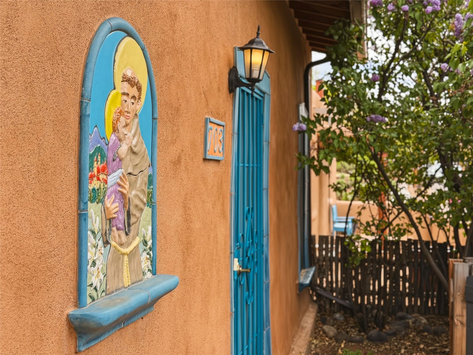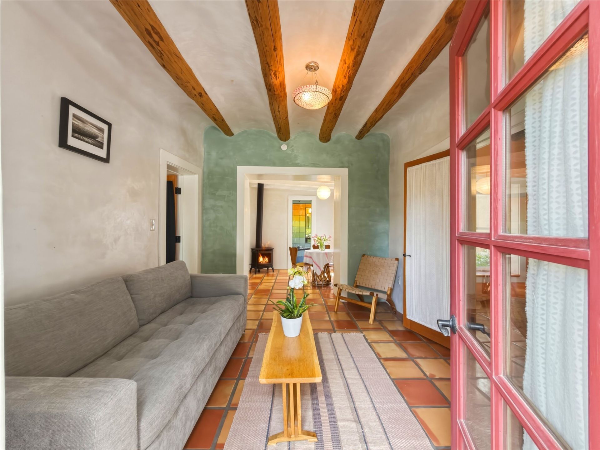 Turns out, the End of the Rainbow is a 1910 adobe on Galisteo Street, just 5 blocks from the Santa Fe Plaza, saturated with color, craft, and personality. Built over a century ago and timelessly remodelled in 2013, this historic Santa Fe home features traditional coved ceilings, diamond plaster, and thick adobe walls. There is even a small plexiglass 'peep window to view the original adobe. Although her New Mexico roots are strong, so is her artistic spirit. The Rainbow Music Bathroom is a celebration of ombre rainbow tile art that will lift your spirits. The colorfully tiled kitchen is surprisingly spacious for a petite home. Although there is a small front yard that is a blank slate for your imagination, the very private back patio continues the ombre rainbow theme with accented window trim, a colorful gate, and even a few colorful bricks. Thoughtful details such as ombre tiled window sills, colorful custom lighting, and special art pieces in the exterior stucco make this one of the most enchanting homes you will ever see. Imagine walking from your Rainbow Casita to restaurants, coffee shops, yoga, tap rooms, and the Santa Fe Plaza. This authentic home never breaks character, and neither do you.