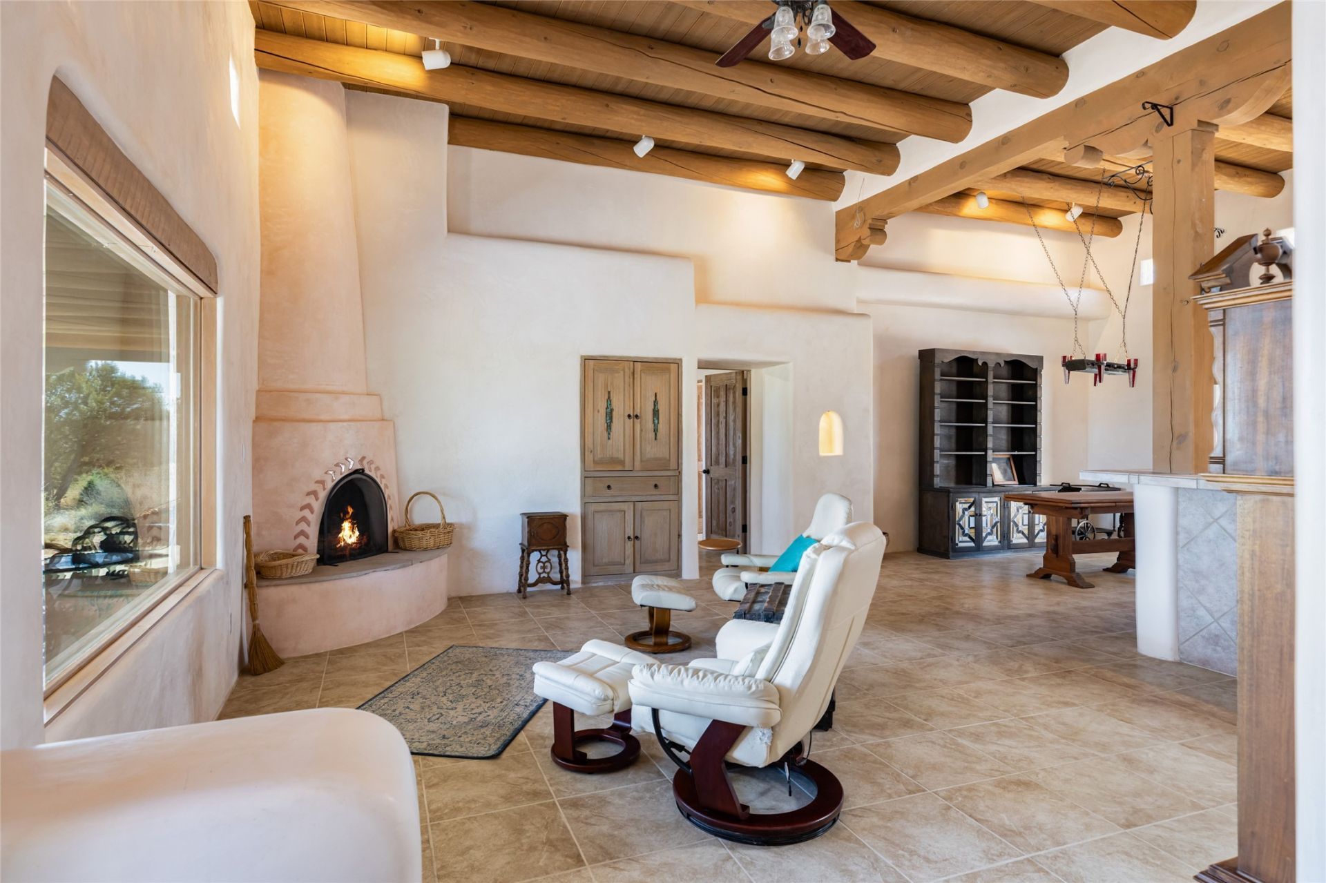 A Special Place In New Mexico - On this unique five-acre property, a stunning main house and versatile detached casita, art studio and separate workshop are located in a small, private, gated, rural community. Offering panoramic views of Sangre de Cristos, Ortiz Mountains, Cerrillos/Turquoise hills, ending with Lone Butte in the front yard. The Lone Butte area has small ranches, equestrian properties, and expansive private parcels, including movie ranches. Nearby amenities include a brew pub/restaurant, cozy café, feed store, and convenient gas station. Main house features - an impressive grand entryway with a covered portal running the full length of the structure. When you enter, a spacious Great Room greets you with soaring ceilings of wood Vigas, traditionally plastered walls, and beautifully tiled radiant, heated floors. An expansive picture window frames Lone Butte and mountain vistas of Santa Fe as the classic Kiva fireplace creates a warm, inviting space. The large kitchen is designed for both functionality and style with gas cooking, modern stainless-steel appliances, extensive tiled counters, and storage. One counter is bordered by a beautiful walnut snack bar. The kitchen cabinets reflect the custom-crafted cabinets and doors of solid, lightly textured, softly colored wood used throughout the house. The home's layout features a thoughtful split design, with the primary suite to the left of the Great Room and pantry/ laundry room/two-car garage entrance, bathroom and the remaining 2 bedrooms to the right. This provides both privacy and convenience, ensuring comfortable living spaces on either side of the central gathering area. The comfortable primary suite is a truly elegant retreat, with its own classic Kiva fireplace and beautiful, extra-high, beamed Vega ceilings. The bathroom is exceptionally spacious and features a walk-in closet, a luxurious Jacuzzi tub, an extra-large shower stall, dual basins, a skylight and a striking glass block window to fill the room with abundant natural light. Outdoor Living - Step outside to enjoy multiple patios that invite alfresco dining and relaxation areas. The landscaped grounds are thoughtfully arranged with mature trees and shrubs alongside raised vegetable/herb gardens. This Oasis offers both privacy and space for watching the magnificent New Mexico sunrises and sunsets. Casita, Art studio, Workshop - This exceptional detached Casita-Studio-Workshop offers diverse flexibility. Ideal for an office, artist studio, gallery or guest retreat. It includes a bright kitchen with a skylight. The bathroom has a custom-designed tiled shower. A large, comfortable sleeping area with abundant natural light. Sliding doors open onto a secluded courtyard facing the magnificent Lone Butte. The laundry/utility room connects the art studio/Casita to the impressively sized (approx. 40-foot-long) workshop. It features: a washtub, two overhead doors allowing seamless indoor-outdoor functionality for projects of all