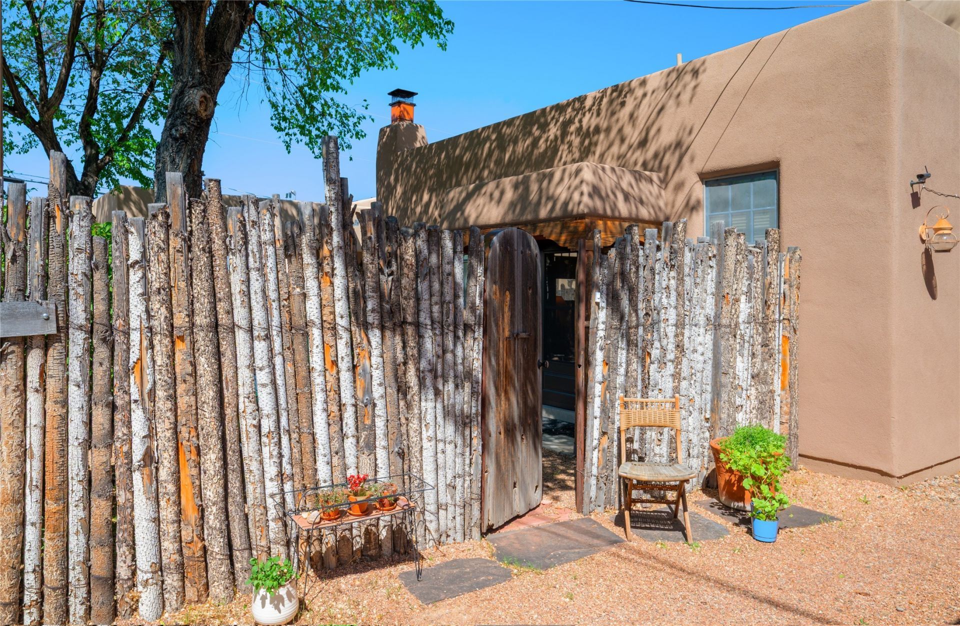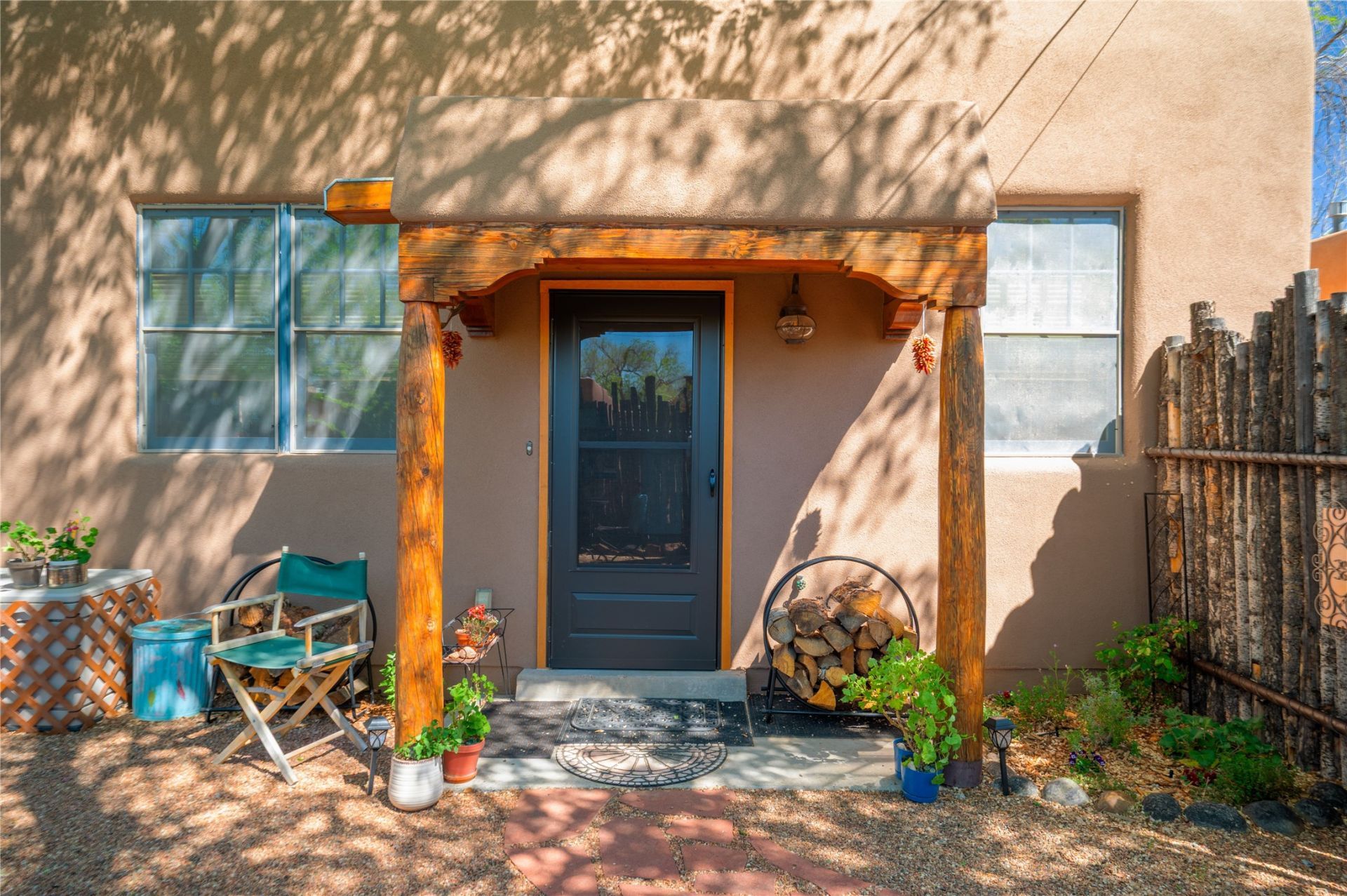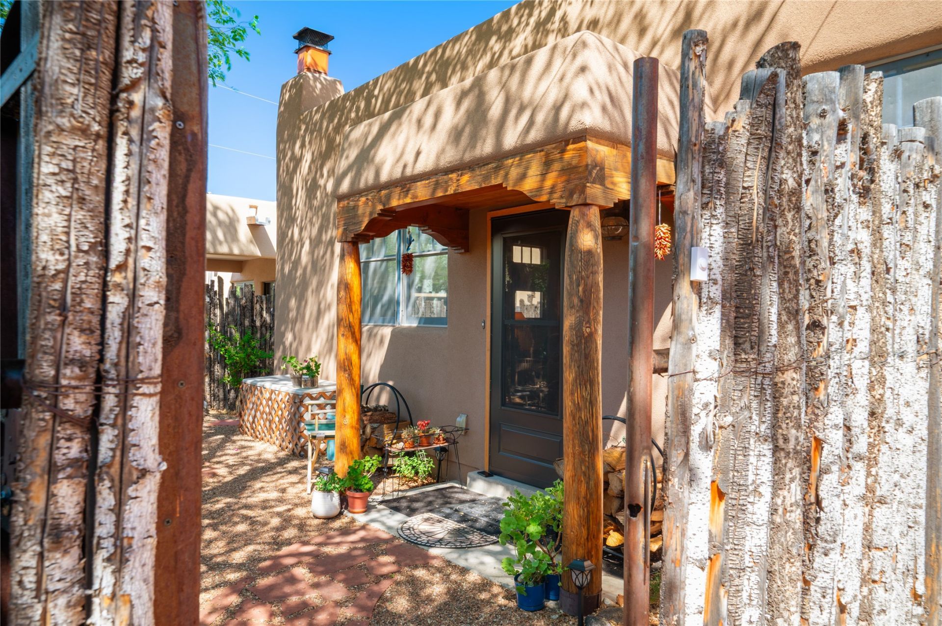 Beautifully unique attached Casita. Totally turn-key 'Pied-a-terre! Enjoy this meticulously cared for condo in a quiet neighborhood with convenient access to downtown / Santa Fe Plaza. Private entrance and flagstone walks landscaped courtyard with shade trees. High quality level of interior finishes with tiled floors through-out. Marble Tiled Jetted Tub. High wood ceiling, large vigas in living area, Kiva fireplace, 6 panel pine and custom interior doors, bronze hardware. Newly Built-in Custom Armoire with bronze studded hardware on antique Teak double doors. Fully furnished with modular birch cabinetry and drawers in the Living Room. Gourmet Kitchen w/ chef's surfaces in stone and tile. All appliances are included. Includes, 2 car off-street parking spaces.